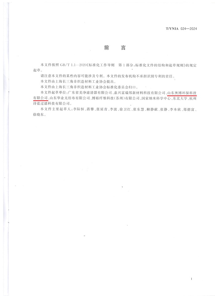 作為國內(nèi)功能性新材料領(lǐng)域的領(lǐng)先企業(yè),山東奧博環(huán)??萍加邢?/span>公司參與團(tuán)體標(biāo)準(zhǔn)T/YNIA 024-2024《抗靜電、阻燃納米纖維復(fù)合濾材》的起草與制定工作,標(biāo)志著山東奧博環(huán)保在技術(shù)創(chuàng)新與行業(yè)規(guī)范建設(shè)方面取得雙重突破。